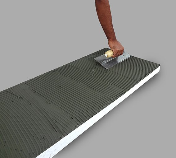 Apply Styrofix adhesive to the entire back surface of the insulation board using a notched trowel. (Coverage: 4 – 5 kg/m²) |