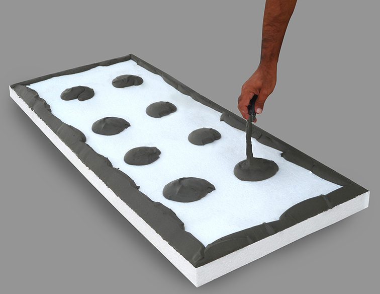 Apply Styrofix adhesive to the external edges and to 8 inner spots on the back side of the insulation board, ensuring it covers 40% of the surface. (Coverage: 5 – 6 kg/m²) |
