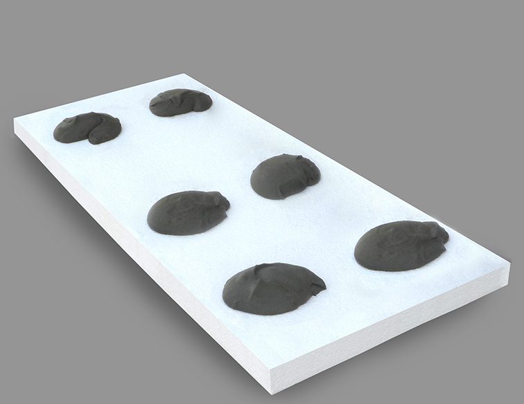 | Apply Styrofix adhesive to 6 inner spots on the back side of the insulation board, ensuring it covers 40% of the surface area. (Coverage: 4 – 5 kg/m²) |