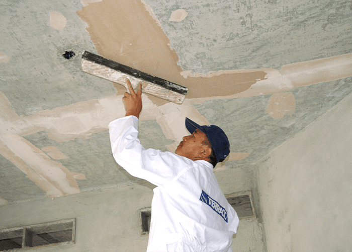 Terraco Sprayplaster Basecoat is ready for use, but can be diluted with 2-3 % water if required. Patch and repair uneven/damaged surfaces. Spray the first coat and level with steel edged spatula. Excess material on the spatula should be returned to the machine. If required, apply a second coat of Sprayplaster Basecoat. Finish the surface with 1 or 2 coats of Sprayplaster Finishcoat.