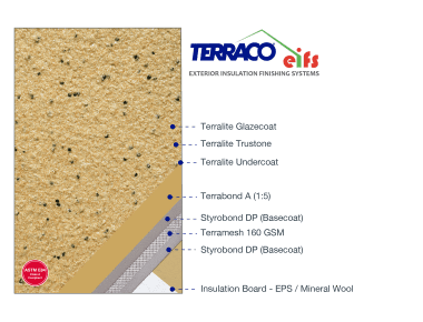 - Apray apply Terraaco Terralite Trustone by hopper gun to create a hammer finish granite effect and allow to dry for 24 hours.