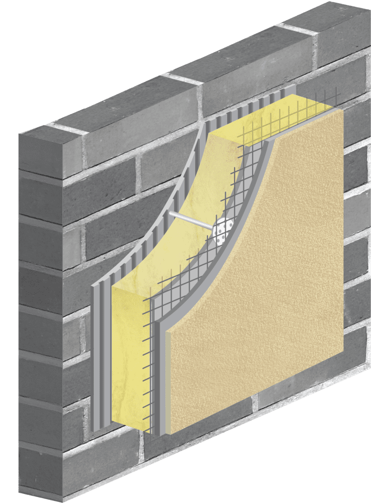 يتكون نظام EIFS هذا مما يُسمى بمكونات النظام، حيث يُثبت MW على السطح باستخدام مزيج من المواد اللاصقة والمثبتات الميكانيكية، ويُعزز بطبقة أساسية وشبكة من الألياف الزجاجية، ويُغطى بطبقة تزيينية للجدران.