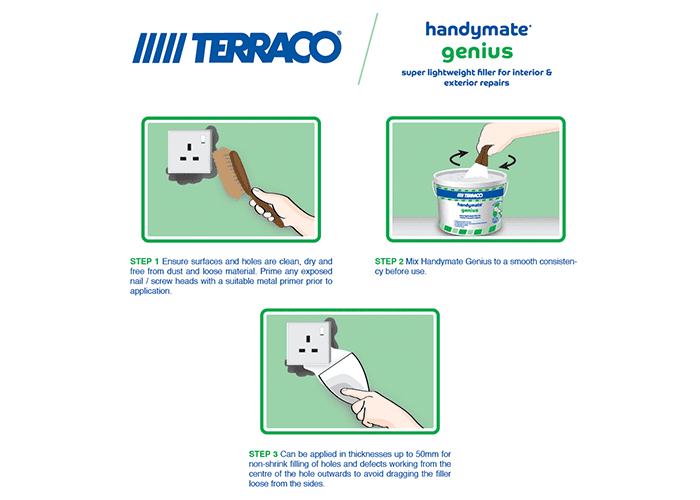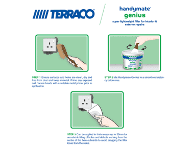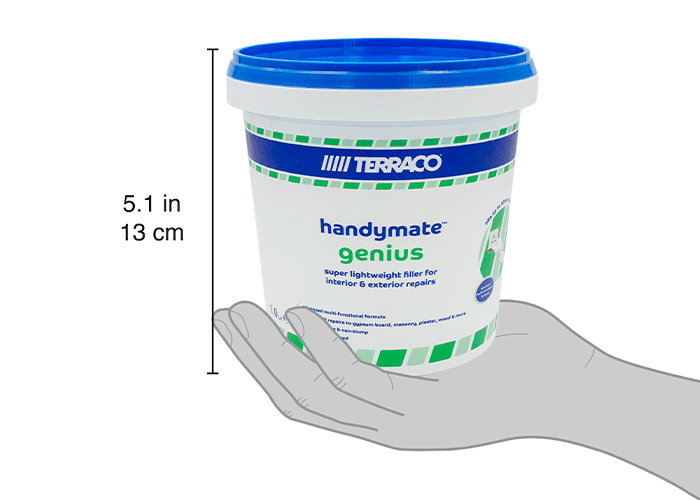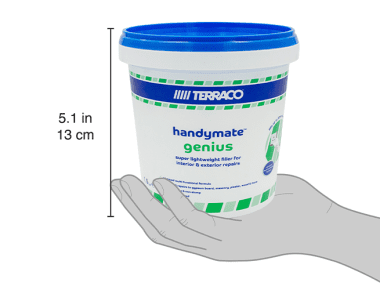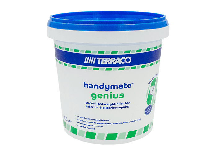 Handymate Genius is a ready-to-use, super lightweight high-performance filler for interior and exterior repairs where non-shrink deep filling is required. Handymate Genius will surface dry in 30-60 minutes depending on thickness and temperature. Designed for deep one-shot repairs of up to 50mm in plaster, gypsum board, masonry and wood that is intended to be painted.