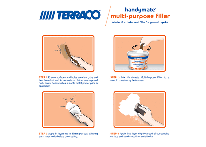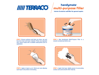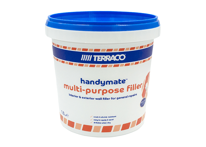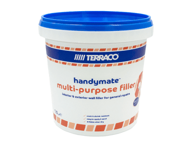 Handymate Multi-Purpose Filler will surface dry in 2-4 hours depending on thickness and temperature. Ideal for repair of masonry, brick, concrete, plaster and plasterboard. Suitable for interior and exterior repairs of up to 10mm in thickness. Drillable when fully dry.