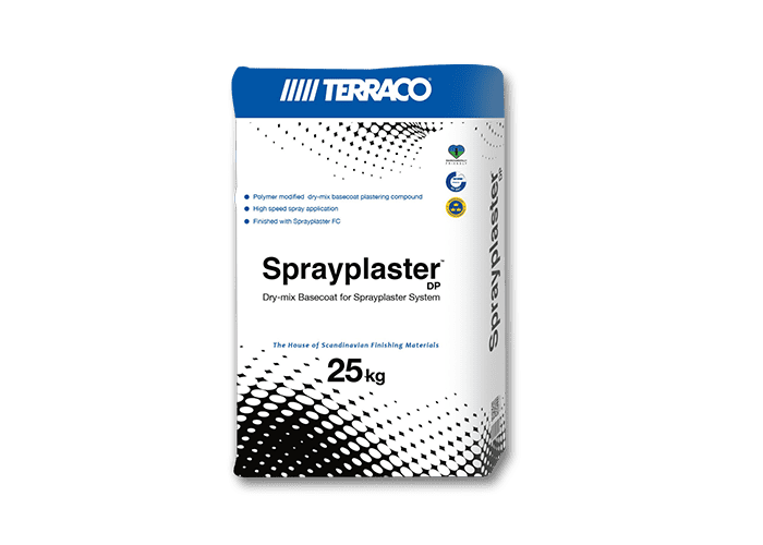 Sprayplaster DP Basecoat is a polymer enhanced sprayable cementitious plaster which is used as a basecoat plaster for the Terraco Sprayplaster system.