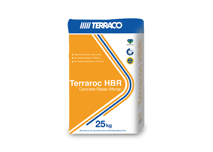 Terraroc HBR is a high build polymer modified repair mortar with fibre reinforcement suitable for concrete repairs up to 80mm on vertical surfaces and 40mm in overhead applications. Terraroc HBR is shrinkage compensated and is sprayable enabling fast repair.