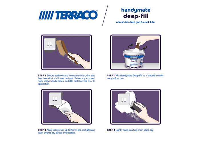 Pürüzsüz bir yüzey elde etmek için zımparalanabilir, büzülme/çökme veya çatlama yapmaz. Handymate Deep-Fill uygulama kalınlığına ve ortam sıcaklığına bağlı olarak 1-2 saat içinde kurur. İç ve dış cephede yer alan sıva, alçı levha ve duvardaki 20 mm’ ye kadar olan deliklerin onarımı için uygundur. Prizler ve pencere çerçeveleri etrafındaki daha derin onarımlar için idealdir. Handymate Deep-Fill tamamen kuruduktan sonra, matkapla/ vida ile delinebilir, üzerine çivi çakılabilir. Kuruduğunda boyanabilir.