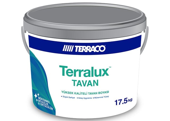 Terraco Terralux Tavan Boyası, uygulandığı yüzeyde yüksek örtücülük ve beyazlık sağlar. Kolay uygulanabilir, akma ve sıçratma yapmaz. Rulo izi bırakmaz, uygulaması kolaydır. İçeriğindeki kaliteli ham maddeler sayesinde uygulandığı yüzeye tam bir yapışma sağlar, kabarmaz, dökülmez. Teneffüs edebilme özelliği sayesinde yüzeydeki rutubetin dışarı atılmasını sağlar.