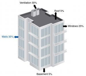 The following diagrams illustrate the contributions of external walls to heat and cooling loss in single-family homes and multi-story buildings: